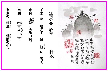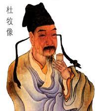 杜 牧(と ぼく、803~853年)は中国、晩唐期の詩人。京兆府万年県(現陝西省西安市)の人で、字(あざな)は牧之。号は樊川(はんせん)。晩唐の繊細な技巧的風潮を排し、平明で豪放な詩を作った。風流詩と詠史、時事諷詠を得意とし、艶麗と剛健の両面を持つ。七言絶句に優れた作品が多い。杜甫の「老杜」に対し「小杜」と呼ばれ、また同時代の李商隠と共に「晩唐の李杜」とも称される。 祖父に中唐の歴史家・杜佑を持ち、詩人の杜荀鶴は庶子と言われる。江南の風景を絵画のように表現した「江南春」に惹かれた。