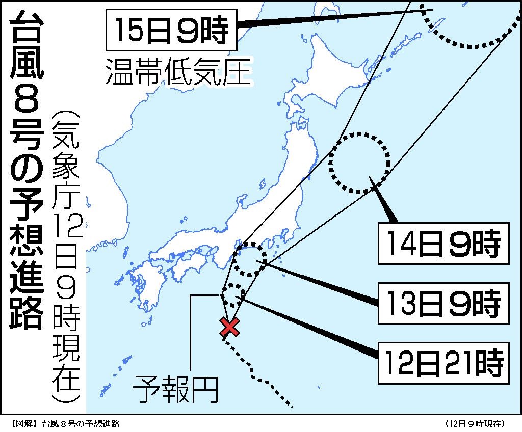 台風8号、東海関東上陸の恐れ 北海道と東北、前線と低気圧で大雨―気象庁 ―― 気象庁は12日、紀伊半島から南へ離れた海上で午前3時に熱帯低気圧が台風8号に変わったと発表した。13日に東海や関東に接近し、上陸する可能性が高い。東海では雨が強まり始め、同庁は大雨や高波に警戒し、強風に注意するよう呼び掛けた。交通にも影響する恐れがある。