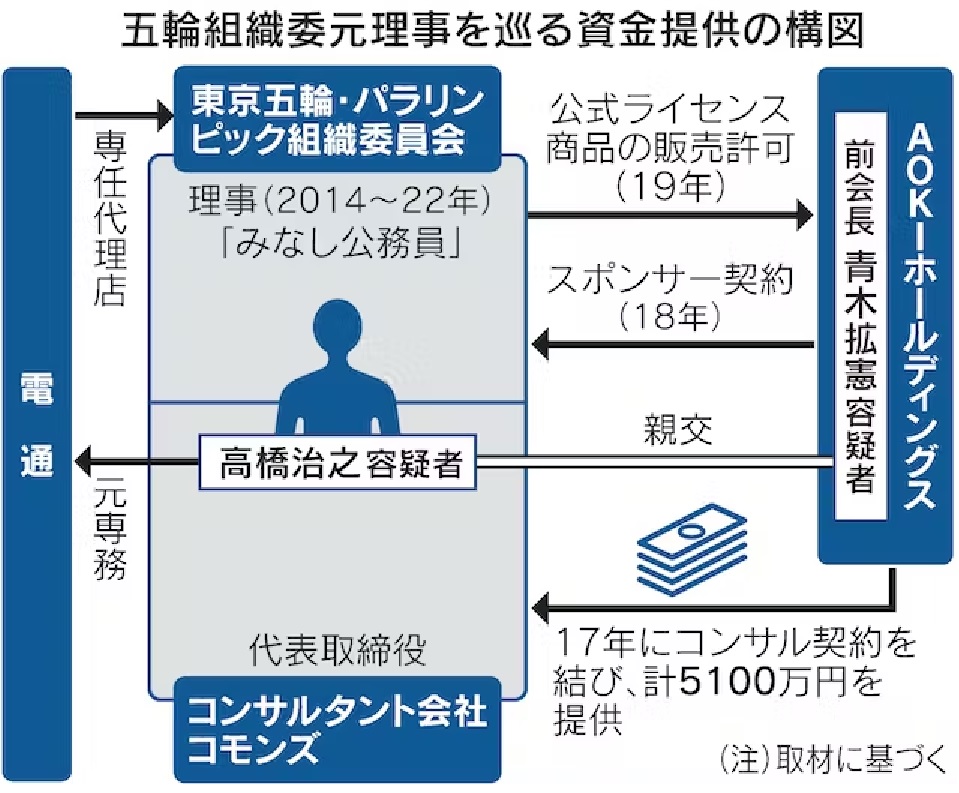 「第一人者」影響力頼み AOKI、五輪公式商品販売狙う ―― 東京五輪・パラリンピックから1年。東京地検特捜部が大会を巡る不透明な資金の本格解明に乗り出した。大会組織委員会元理事の高橋治之容疑者(78)は容疑を否認し、徹底抗戦の構えだ。大会スポンサーだったAOKIホールディングス(HD)前会長の青木拡憲容疑者(83)から高橋元理事は何を依頼され、どう動いたのか。汚職事件の背景を追った。