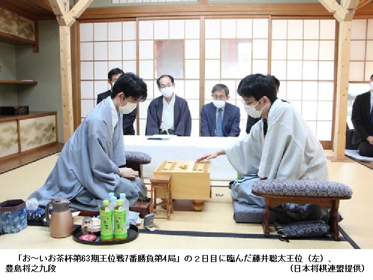【王位戦】藤井聡太5冠「予想していた手ではなかった」豊島将之九段の強襲封じ手にも対応 ―― 将棋の最年少5冠、藤井聡太王位(竜王・叡王・王将・棋聖=20)が豊島将之九段(32)の挑戦を受ける、「お~いお茶杯第63期王位戦7番勝負第4局」が24、25日の両日、徳島市「渭水苑」で行われ、先手の藤井が95手で勝ち、対戦成績を3勝1敗とし、3連覇まであと1勝とした。第5局は9月5、静岡県牧之原市「平田寺」で行われる。
