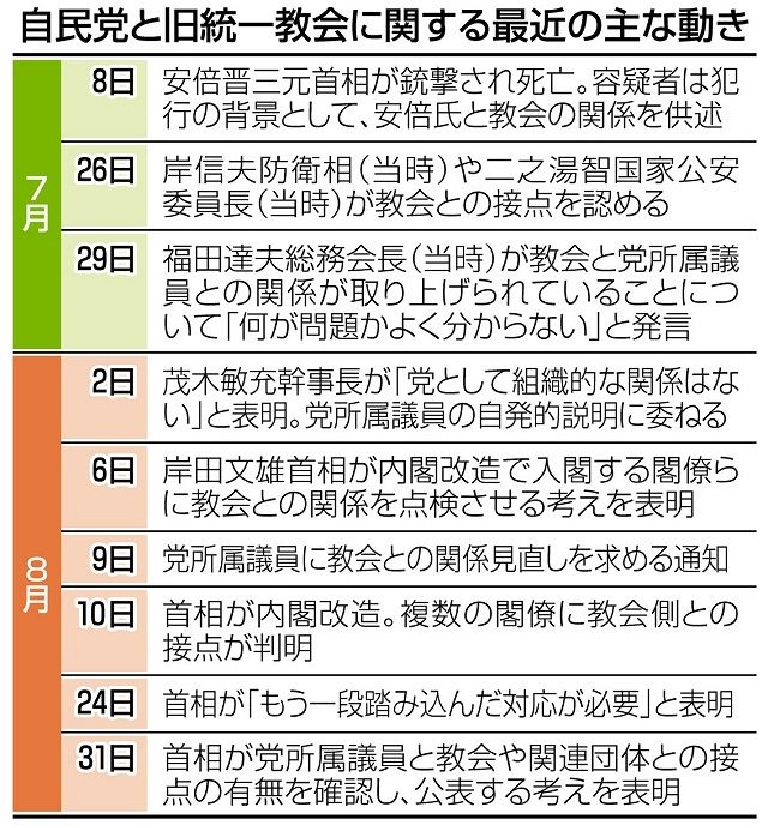党が8月26日に始めた調査では、教会側から選挙支援を受けたかどうかや、教会主催の会合に出席したり、祝電やメッセージを送ったりしたかなどについて、9月2日を期限に回答を求めている。選挙支援を受けるなどした議員に限って、氏名を明らかにする方向で検討している。首相は「(教会と党所属議員が)密接な関係を持っていたのではないかと、国民から引き続き懸念や疑念の声をいただいている。重く受け止め、党として説明責任を果たす」と強調した。