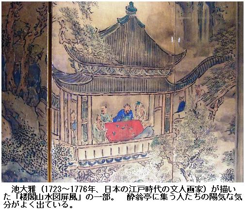 谷川に出かけて魚を取ると、谷が深いので魚は肥え、泉の水で酒を醸せば、泉の香りがして酒はすむ。山の肴に野の蔬菜、雑然と前に並んだのが、太守の宴会。宴たけなわの余興は、琴でもない笛でもない。的を射当て、碁をして勝てば、杯を取り交わし、投壺の矢が投げ交わされ、立ったり坐ったり大声で騒いでいるのは、客たちのはしゃいでいる姿。やつれた顔、白い髪。人々の間で形をくずして坐っているのは、太守の酔うた姿である。/やがて夕日が山に落ち、人影がまばらに散って行くのは、太守が帰り、客たちがお供をするのだ。木々の林がかげり始め、鳴き声があちこちで聞こえるのは、行楽の人が去った後、小鳥たちが楽しんでいるのだ。しかしながら小鳥たちは山林の楽しみを知って入るが、人の楽しみを知らぬ。人は太守の行楽のお供をする楽しみを知ってはいるが、太守が人の楽しそうなのを楽しんでいるのをしらぬ。酔えばその楽しみが分かち合え、醒めれば文章で述べるのは、太守である。太守とは誰のことが。盧陵の欧陽脩、この私である。