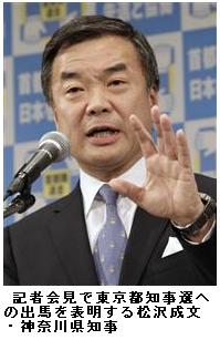 神奈川県知事がなぜ? 都知事選 松沢氏が出馬表明 ―― 一日の記者会見で「首都圏、東京のリーダーシップによる日本再生」を訴えた。都民からは「クリーンな印象がある」との声も聞かれたが、神奈川から東京へのくら替えには疑問や批判的な声が多かった。/墨田区のパン店経営北条宗利さん(75)は「何で神奈川県知事が都知事を目指すのか理解できない。知事ってそういうものじゃないはずだ。東京をよく知っている人にやってほしいね」と不思議そうに話した。/「都内の市議会や区議会などで都の政治を経験した人になってほしい」と訴えるのは調布市の主婦岡部奈穂子さん(31)。「石原さんはやり方が強引な所はあったが、一本筋が通っていたし、もう一期やってもよかった。ワタミの渡辺さんは都知事を経営と考えている点に違和感を感じる」との見方を示した。/豊島区の美容師石川みどりさん(21)は「政治にあまり関心はないけど、残された神奈川の人たちはどうなっちゃうんでしょうか。劇的に政治が良くなるように、三十代や四十代ぐらいのもっと若い人が選挙に出ればいいのに」と話した。/知名度にはやや不安な面も。板橋区の主婦林美由樹さん(32)は「初めて聞いた名前。なぜその人がいきなり出ることになったのか。東国原さんが出るなら投票したい。宮崎を活性化させた実績があるし、これまでと違う方向に東京をもっていってくれそう」と出馬を明言していない著名人に期待を寄せた。/就職活動中に池袋駅前にいた板橋区の大学三年浦沢健介さん(21)は「松沢知事の顔と名前は知っているが、どんなことをしてきたかは知らない。なぜわざわざ神奈川から来るのか。行政経験が政治の実力に比例する訳ではないのでは」と首をかしげた。/中央区の消費者団体役員成沢敏枝さん(77)は「神奈川県知事が何のために出馬するのか。神奈川で成功したことが東京で成功するとは限らない。いろいろ名前が挙がっているが、皆軽さを感じる。現時点で投票したい人はいない」と不満を示した。/文京区内で歴史的建物を保存する活動をしているNPO法人理事多児貞子さん(65)=豊島区=は「人柄も実績もよく知らないが、クリーンな印象はある。ただ、途中で県政を投げ出してくるのは神奈川県民に対して失礼。都知事には都民のニーズをつかめて、しっかりしたビジョンと実行力のある人になってほしい」と話した。/ くら替えに好意的な意見もあった。八王子市の自営業男性(56)は「びっくりはしたが、神奈川県知事を二期務め、三期というのは個人的に長いと思うし、地方自治に明るい人が舞台を変えて出るのは『あり』かなと思う。宮崎県の東国原前知事は事情が違う。一期やっただけなので、都知事は時期尚早と思う」と話した。