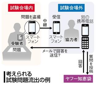 京都大が不審なトイレ利用調査 全試験官に報告求める ―― 入試問題がインターネットの質問サイトに投稿された問題で、京都大がすべての試験官に対し、試験中に頻繁にトイレに立った受験生がいなかったかどうか報告を求めていることが1日、分かった。/受験生が、第三者からサイトに寄せられた回答をトイレで確認していた可能性があるためで、京大は不審なケースが見つかれば、京都府警と連携し、特定を進める。/投稿は2月25日午後の「文系数学」全6問と、同26日午前の英語の英作文2問で、試験開始の7分後からインターネット検索大手「ヤフー」のサイト「ヤフー知恵袋」にあった。これに対し、数学5問と英作文1問について、複数の第三者が試験中に回答していた。/試験問題の投稿は、小型カメラなどを使い、教室から外部へ送信したとの見方もある。だが回答は数回に分けて書き込まれており、そのたびに教室で確認すると怪しまれるため、トイレを利用したことも考えられる。京大は、頻繁にトイレに行ったり、長時間こもるなど、不審な受験生がいなかったか調べる。/京大によると、文系数学の受験者は約2500人、英語は約8000人。試験官は各教室に2~10人が配置されていた。 (47NEWS、2011/03/01 06:31 【共同通信】)