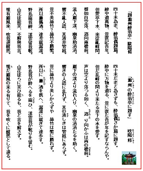 1046(慶暦6)年、欧陽脩が、滁州太守に在任中の作で五言古詩。酔翁亭は滁州の西南の山中、醸(じょう)泉(せん)という泉に臨む亭で、此処にすむ智(ち)僊(せん)という僧が建て、作者が命名したことは、『酔翁亭之記』で述べている。