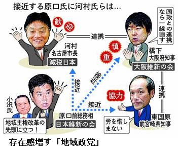 ◇「日本維新の会」に党内対立の影:民主党内では、小沢一郎元代表に近い新人の衆院議員16人が菅直人首相に公然と退陣要求するなど党内対立が深刻化し、内閣支持率は下落の一途だ。小沢氏に近い原口氏がこの時期に「日本維新の会」旗揚げを表明した背景には、次期衆院選で苦戦が予想される小沢系議員の受け皿をつくりたいとの思惑が透けて見える。/小沢氏は2月8日に国会内で河村氏と会談して連携を確認。原口氏は、橋下氏や東京都知事選出馬の意向を固めた東国原英夫前宮崎県知事に「地域主権に前向きな人たちの連合をつくる」と秋波を送る。これに対し、橋下氏は「連携が国政についてとなると、一線を画す」と距離を置き、東国原氏は「労を惜しまない」と協力の意向を伝えた。