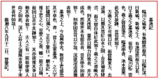 墨地のほとりは、いま州の学問所になっている。教授の王君盛は、墨地の名が廃れるのを恐れて、「晋歐右軍墨池」という六字の書を鴨居に掲げ、さらに私に「記を書いて欲しい」と言って来た。王君の心を推察するに、人の長所を愛するものは、一才能といえども廃れさせるにはしのびず、それが古跡にまで及んだということであろうか。また、かの事跡を推奨して、学ぶ者たちを励まそうというのであろうか。そもそも人に一才能があり、それがこれほど後世の人に尊重されるとすれば、いわんや仁愛の人・厳正の士の遺風が後世に裨益すること如何ばかりであろう。慶暦八(1048)年九月十二日、曾鞏記す。