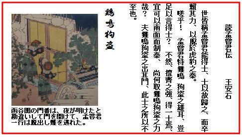 ここに掲げる一文は『史記』孟嘗君伝の読後感である。孟嘗君は戦国時代の斉の王族田文(でんぶん)。多数の食客を養っていた人物として有名。秦に囚われの身となったとき、犬のように家に忍び込むのがうまい家来によって窮地を脱し、さらに国境脱出のとき、鶏の鳴き声のうまい家来によって危機を切り抜けたエピソードはいわゆる「鶏鳴狗盗(けいめいくとう)」の話として有名である。