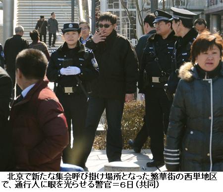 ■警察犬、放水車でデモ阻止:北京でデモ予定場所として予告された王府井のマクドナルド前や繁華街・西単などには同日昼、制服、私服姿の警察官、武装警察数千人が公安の車両とともに展開し、検問、検索を強化した。王府井では警察犬を使った街頭パトロールが行われ、マクドナルド前にも大勢の私服警官が配置された。集会の予定時間の午後2時直前には、放水車が動員され、集会場所に停車した。もう1カ所のデモ予定場所の西単文化広場も四方が木製のフェンスで囲まれ、出入りができないように規制された。上海の人民広場周辺の映画館は営業を中止し、地下鉄駅も閉鎖されたという。/こうした徹底した規制により、中国本土の大半の都市では集会そのものが開けなかったという。先月20日と27日に予定されたデモも公安当局に阻止されている。