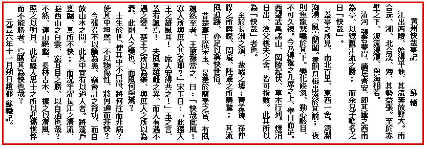 「黄州快哉亭記」は兄の東坡が黄州(湖北省江岡県)に流罪となっていたとき、同じくこの地に流されてきた張夢得(ちょうぼうとく)の亭(あずまや)に「快哉亭」と名をつけてやった事に関するルポである。東坡は「水調歌頭」の調子を用いて詞一首を張夢得に贈ったが、この文はその詞の序のような役割を果たしているという。元豊六年、蘇轍45歳の作である。この三年前、兄を訪ねて黄州・武昌へ行ったときの記憶に基いて書かれたものと思われる。