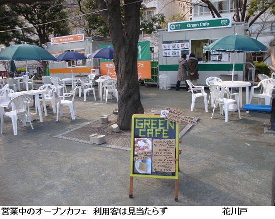 情報につられて、午後からオープンカフェに出掛けてみた。天気は好く日溜まりに出ると春の陽気で、大寒桜は5分咲きで、道行く人がカメラを向けていた。だが、日陰は寒く、オープンカフェは客は0状態である。