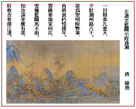元和14(819)年、時の天子憲宗は仏法を信ずる心が厚く、仏舎利を都に招き入れて盛大な供養を催した。かねてから儒教の振興を念じ、園最大の敵は仏教と考えていた韓愈は、当時刑部侍郎(法務省の次官に当たる職)であったが、仏教を痛烈に批判して天子を諌める「仏骨の表」を書き、憲宗に捧げた。憲宗はこれを読んで大いに怒り、作者を死刑にせよと命じたが、とりなす人があって一等を減じ、潮州刺史に左遷することになった。潮州は今の広東省と福建省との境に近い海岸の町で、未開野蛮の土地であり、左遷と言っても事実上は流罪であった。
