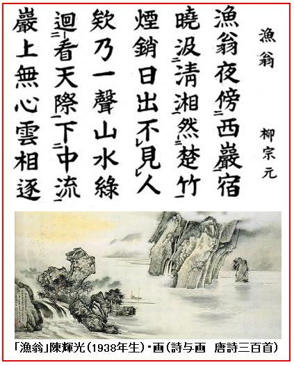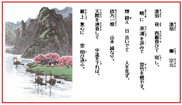 柳宗元の七言古詩「漁翁」は次の五言絶句「江雪」と並び、左遷先の永州での心象風景であるという。漁師の爺さんの姿が仙人じみて印象に残る。