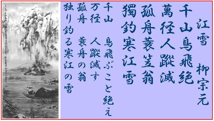 「江雪」も恐らく「漁翁」と同じく配所で見た風景に違いない。五言絶句の傑作と言われる作品だけあってわずか二十文字で一枚の墨絵の世界が目に浮かんでくるようだ。独り魚を釣る老漁夫の姿には隠者への連想がある。隠者は漁夫に身をやつして世を送ることが多い。