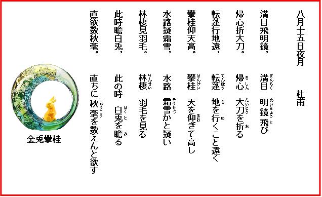 八月十五日の月は、あくまでも明るい。 それは遠くはなれた故郷をも照らしているはずである。 月を見て帰心はいやがうえにもつのる。 根なし蓬(よもぎ)のように風に吹かれて遠くまで来た。 科挙に合格して進士になることは、私にとっては雲の上ほどの高い望みである。 月の明るさに、水路は霜や雪のように白くみえるし、林のなかにかくれ棲(す)む禽獣(きんじゅう)もはっきり見えるほどだ。 月に住むという兎もみえたが、秋になれば生えかわるその毛を、一本一本かぞえたくなるほど明るい。