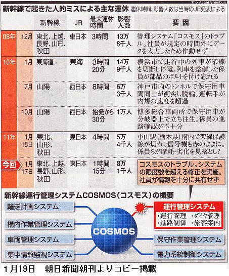 お粗末!新幹線トラブル「今までなかったので」―― JR東日本の五つの新幹線がストップしたのは、延伸や増発にシステムなどの見直しが追いつかず、情報共有も不十分だったことが原因というお粗末さだった。/18日、国土交通省の幹部からは、「いつトラブルが起きてもおかしくなかった」との指摘があがった。政府や同社が世界に新幹線技術の売り込みを図っているさなかだけに、同社幹部は「信頼を損なったことは否めない」と肩を落とした。/「大きな輸送障害を起こし、多くの人に迷惑をかけて申し訳ありません」/JR東日本は同日、東京都渋谷区の本社で記者会見を開き、宮下直人常務取締役らが深々と頭を下げた。/約1時間半に及んだ会見では、同社が新幹線総合管理システム(COSMOS「コスモス」)を1995年に導入して以来、システムが受け付けるダイヤの修正案の上限が1分間に600件のままで、ダイヤの現状に合うよう改善してこなかった点に質問が集中。宮下常務は、「データの処理容量を巡っては、これまでトラブルが無かったので、変えなかった」などと釈明したが、「日々のデータの解析などはしていなかった」と、問題意識が不足していたことを認めた。 (2011年1月19日09時17分 読売新聞)