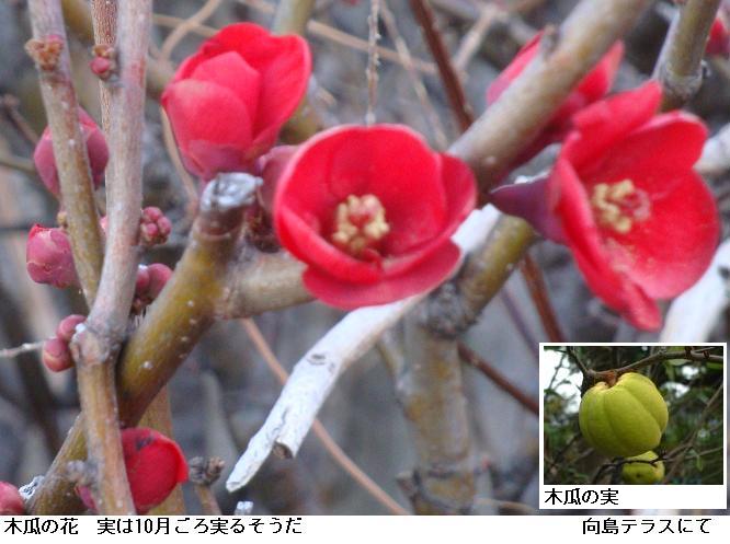 朝食後、隅田川の吾妻橋~白鬚橋を一巡する。一片の雲もなく天気晴朗なれど、少々風があり、冷たい。隅田川の墨田区側のテラスには木瓜(ぼけ)が咲き始めている。