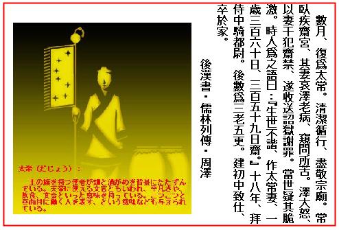 この詩は李白が安陸(今の湖北省)で結婚生活を送っていたとき、妻の許氏に贈った詩という。李白は後漢の周澤の故事にことよせ、自分を太常になぞらえた詩を妻に贈ったのであろう。李白は毎日酔いつぶれて妻を放っておいたのだろうか。しかし、許夫人との間に二人の子を設けているということである。