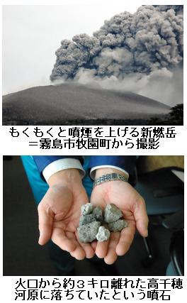 噴石・灰…火口から火柱も 新燃岳噴火、警戒続く ―― 霧島連山・新燃岳の噴火活動は27日も活発に続き、近隣の霧島市や曽於市を中心に県内でも様々な影響が出ている。鹿児島地方気象台は今後も活発な活動が続くとして、引き続き警戒を呼び掛けている。/火口から約3キロ離れた霧島市の高千穂河原では27日朝、5センチ大の噴石と火山灰が3センチほど積もり一面白くなった。近くの保育園が自主休園したが午後7時現在、市に被害の報告は入っていない。/市は新燃岳噴火対策の警戒本部会議を開き、大浪池登山口など2カ所に「火口から半径2キロ以内の立ち入り規制」の看板を設置することを報告した。会議後、火口から約3キロ離れた場所から新燃岳を視察した前田終止市長は「噴煙はすごいの一言。市民の安全、安心のために専門家の意見も聴きながら最大限の対応をする」と語った。/火口から約3キロにある温泉の宿泊施設の責任者、岩元宗孝さん(62)は「万が一のことを考え、26日の夜は宿泊のお客さんは別の所に泊まってもらった。予約のお客さんには事情を説明して宿泊をお断りしている」と困惑の表情。「夜は火口から火柱が上がっているのが見えた。山火事が心配だ。早くおさまってほしい」と心配そうに話した。