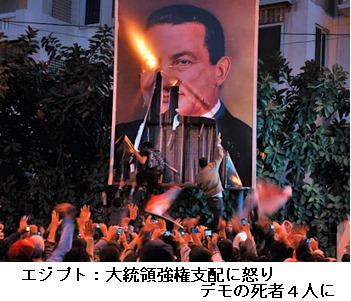 エジプト騒乱状態に、デモ5日目 外出禁止令無視、略奪も ―― 【カイロ共同】エジプトの大規模な反政府デモ発生から5日目となった29日夜、首都カイロでは商店が襲撃され略奪が横行、発砲音も頻繁に聞こえるなど騒乱状態に陥った。市中心部のタハリール広場には、夜間外出禁止令を無視して多数の市民が集まり、ムバラク大統領の辞任を要求した。/一方、フランスのサルコジ大統領とドイツのメルケル首相、英国のキャメロン首相は29日、共同声明を発表し、ムバラク大統領に対し、武力の不行使と、民衆の「正当な要求に対して自ら変革に参加する」ことを求めた。強権体制からの脱却を強く促したものとみられる。/カイロでは警官の姿が消え、軍の装甲車などが政府施設付近に展開。国防省報道官は、国民に外出禁止令の順守を呼び掛ける一方、自らの身や財産は極力自分で守るよう要請、治安当局が事態を十分に掌握できていないことを示唆した。/ムバラク大統領は29日、側近のスレイマン情報長官を副大統領に任命したが、デモ参加者からは任命に抗議する声が相次いだ。/中東の衛星テレビ、アルジャジーラによると、カイロなどでは略奪や暴徒から身を守るため自警団が組織され、暴徒との間で銃撃戦が起きている。 (2011/01/30 11:22 【共同通信】)