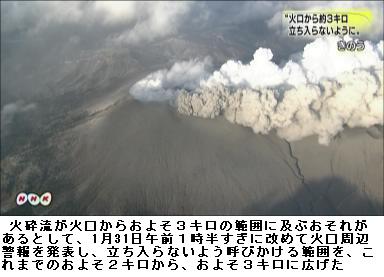 鹿児島地方気象台によると、27日午後3時41分に噴煙の高さ2500メートルを超える爆発的噴火があった。1959年以来、52年ぶりの爆発的噴火だという。活発な火山活動は続く見通しで、気象台は噴石に警戒を呼びかけるとともに、風向き次第では各地に降灰の可能性があるとしている。 (asahi.com 2011年1月28日)
