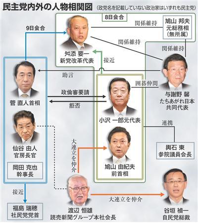 首相、舛添氏と会談:民主党の内紛がここまで過熱する背景には、来年の通常国会や来春の統一地方選をにらみ「菅政権のままでは持たない」(小沢氏に近い若手議員)との観測が強まる一方「ポスト菅も党内に見あたらない」(ベテラン議員)という事情がある。内閣支持率も下がり続けているが、誰もが明確な出口戦略を描けていない。/こうした状況で、小沢氏が新党結成の可能性に言及した。問題は民主党内で小沢氏と行動を共にする議員が何人いるかという点だ。/小沢氏は9月の代表選で民主党議員200人の支持を得た。当然、そのすべてが小沢氏の新党に参加するわけではない。しかし、衆院議員「306人、横路孝弘議長を含む)のうち六十数人が民主党を離脱すれば、衆院の過半数を割り込むことも事実だ。/政党の枠を超えた動きも活発化している。/首相は9日、都内のホテルで新党改革の舛添要一代表と会談した。両氏は「今、日本は危機的な状況にある」との認識で一致したという。舛添氏は8日には小沢氏と鳩山由紀夫前首相、鳩山邦夫元総務相とも会談した。首相と11月18日に会談した与謝野馨・たちあがれ日本共同代表は近く、小沢氏と囲碁をする。