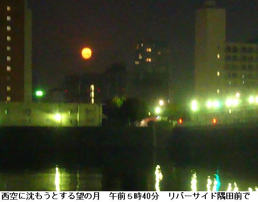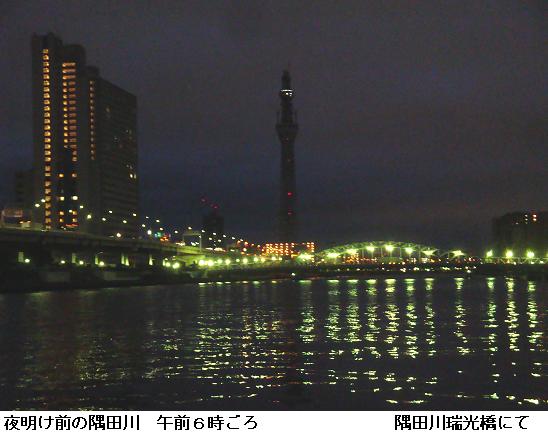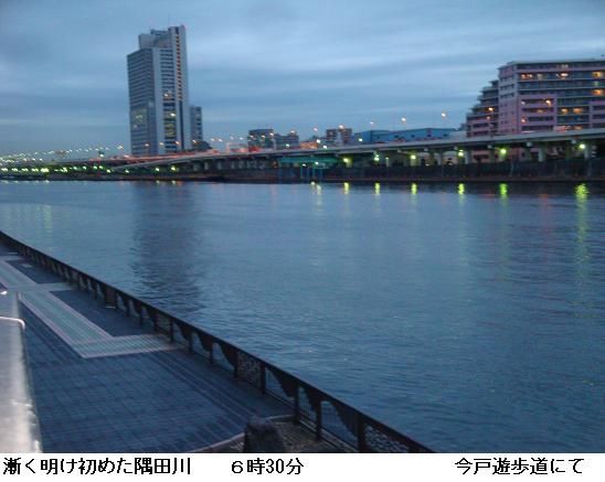 起き抜け5時に家を出る。東白鬚公園を抜けて水神大橋を渡り、隅田川一巡して帰宅する。今日の東京の日の出は6時43分。帰宅は7時であるから、徘徊の大部分は夜道である。瑞光橋を渡り、明治通りを横切る頃、隅田川の東岸が白み始める。今日は曇り空で朝焼けは見られない。今戸遊歩道にかかる頃やっと夜が明ける。