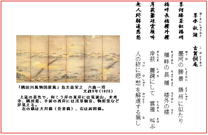 訳)隅田川の景色は、繁華で有名な揚州に似ている。/橋の畔(ほとり)には更に長い橋、高楼の向こうに更に高い楼。/岸の荻はさびしくまばらで、雲のかなたで雁が悲しげに叫ぶ。/しかし、ここではそんな秋の愁いを感じる人などはいないのだ。