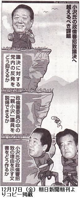 国会招致 小沢氏きょう拒否回答 ―― 民主党の小沢一郎元代表は十六日、自らの国会招致問題をめぐる岡田克也幹事長からの会談要請について、十七日に文書で回答する意向を岡田氏側に伝えた。小沢氏は会談に応じず、岡田氏が求める衆院政治倫理審査会(政倫審)にも出席しない考えを伝えるのにとどめる。/小沢氏は十六日夜、都内で鳩山由紀夫前首相、輿石東参院議員会長と会談した。岡田氏との会談について「直接言ってくれば、いつでも会う」などと話していたという。/これに先立ち、岡田氏は同日午後、菅直人首相、輿石氏と首相官邸で会談。小沢氏が十五日の会合で、政倫審への出席を拒否する考えを示したことを踏まえ、対応を協議した。/この後、岡田氏は記者会見で「(小沢氏とは)なるべく早く会いたい。いつまでも時間がかかっていい話ではない」と述べ、小沢氏が早急に会談に応じるよう求めた。/小沢氏の国会招致については「議決にならない方がいい」と自発的な出席への期待感を示した。小沢氏が拒否した場合には「国会に関することの議決機関である役員会から一任を受けている」と述べ、自らの判断で政倫審での議決に踏み切る可能性を重ねて表明した。/首相は十六日夜、自ら小沢氏と会談する可能性について「岡田幹事長から話があれば検討する」と述べた。 (東京新聞、2010年12月17日 朝刊)