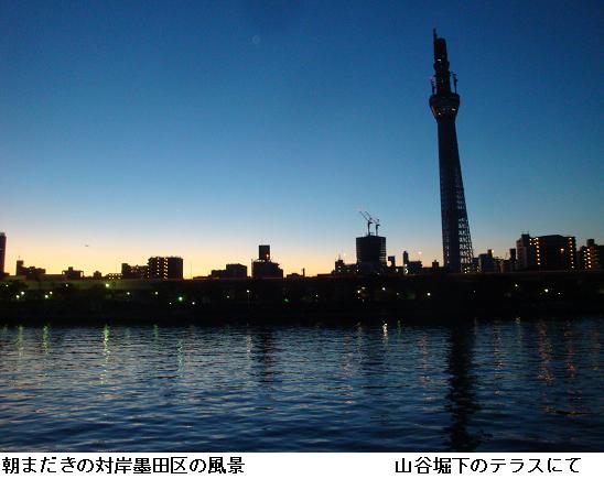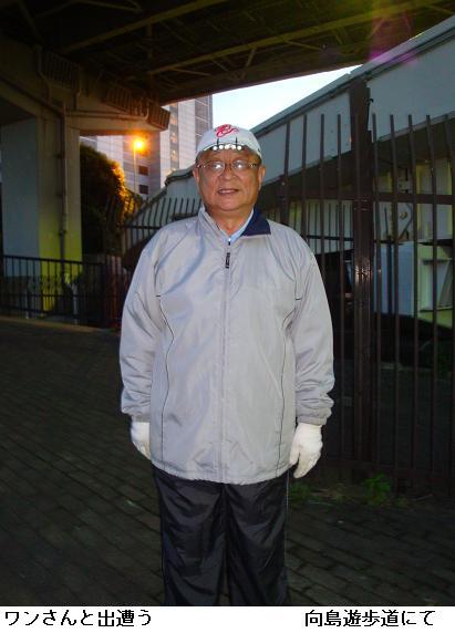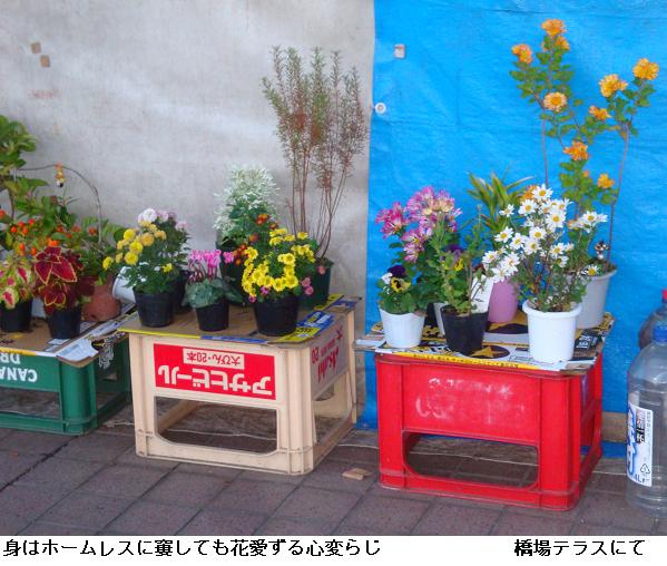 11月20日(土)も5時前から19日と同じコースを一回り。テラスで暮らすホームレスの人々も寒い朝を迎えて、まだ起きだしていない。しかし、身はホームレスに窶しても、花愛ずる心を忘れず、小屋の前にビール箱を設え、鉢植えの草花を並べている人もいる。何時もこの時間白鬚橋を渡って橋場・今戸のテラスをパトロールするお巡りさんと出会う。テラスを使用して塵を散らしたままという不謹慎な野郎がいて、パトロールというより、塵拾いと言うかビニール袋を提げての巡察はまことにご苦労なことではある。