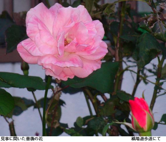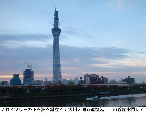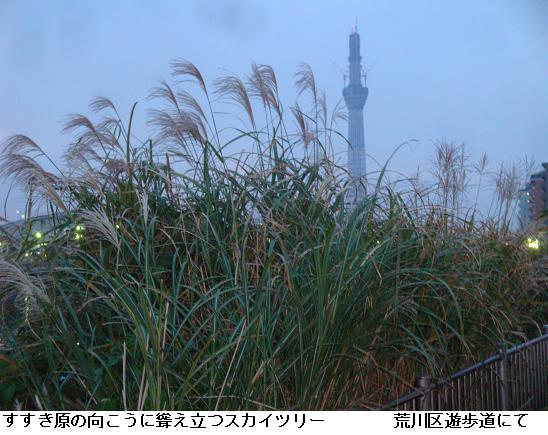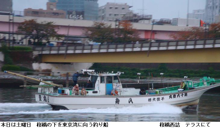 この間まで猛暑だ酷暑だと騒いでいたが、いつの間にか芒河原や秋色を深めた樹木の向こうに東京版バベルの塔を望むようになった。橋場遊歩道のマンションの裏庭には見事な薔薇がピンクの花をつけている。テラスに降りると、本日は土曜日ということもあって、東京湾に向う釣り船が何艘か見られた。テラスには三線(サンシン)鳴らしながら沖縄民謡を謳っている人もいる。しばし、その歌声に聞き入るのであった。