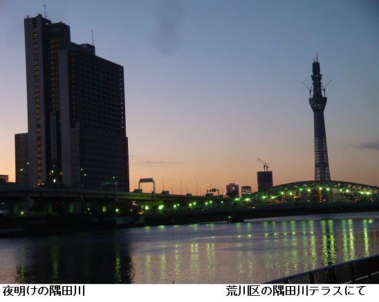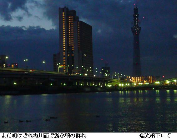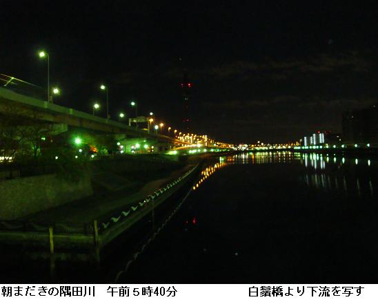 桜橋を渡って墨堤通りを北上。東白鬚公園の北ゲートから公園内に入り、東京都立リハビリテーション病院の前を通り、水神大橋をわたる頃漸く辺りが白み始め。テラスを南下して、石濱神社前から遊歩道に上がる。明治通りを横切って、橋場の遊歩道からテラスに降りる。桜橋まで南下して帰宅。