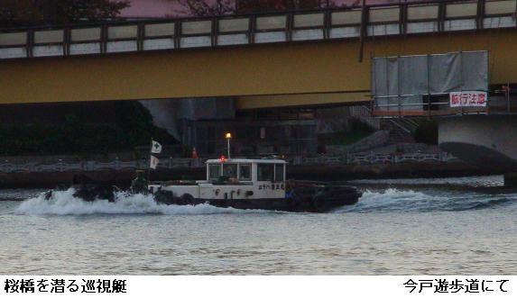 昨日は桜橋を渡り、向島の遊歩道を北上、白鬚橋を渡り、橋場のテラスに降りて、ここを一気に吾妻橋まで南下。吾妻橋を渡り、枕橋から向島遊歩道を桜橋まで北上。桜橋を渡って帰宅した。前日の8の字徘徊を今朝はBの字徘徊と相成った。桜橋の処で、白鬚橋から下って来るワンさんの写真を撮ったが、ブレが激しく削除。