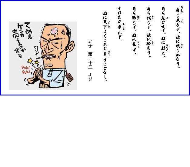 自分で自分を見せびらかそうとしないから、(かえってその存在が)明らかになり、自分で自分を正しいとしないから、(かえってその正しさが)はっきりとし、自分のしたことをはなにかけないから、功績も上がり、自分から尊大に構えないから、いつまでも持ちこたえられる。そもそも(自分を立てて人と)争う事をしない。だから、世界中に争うことの出来る者がいないのである。〔老子第22より〕