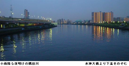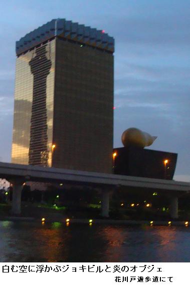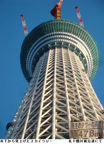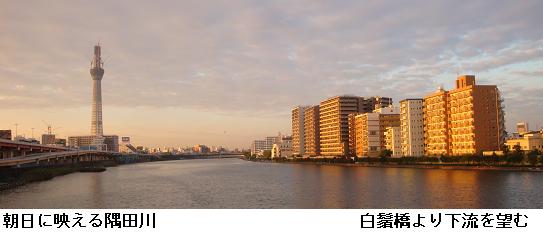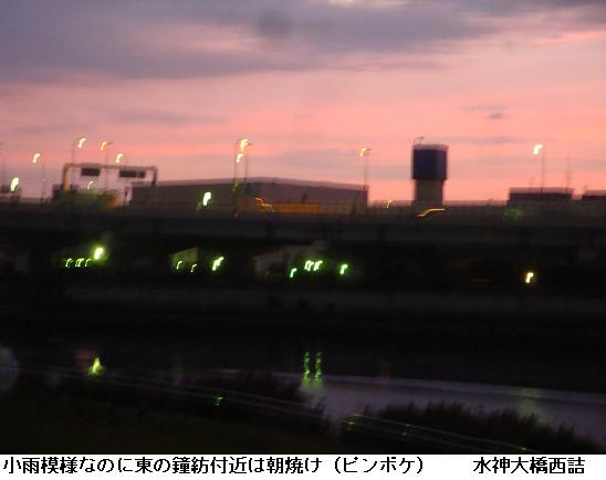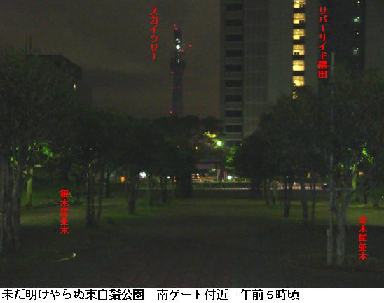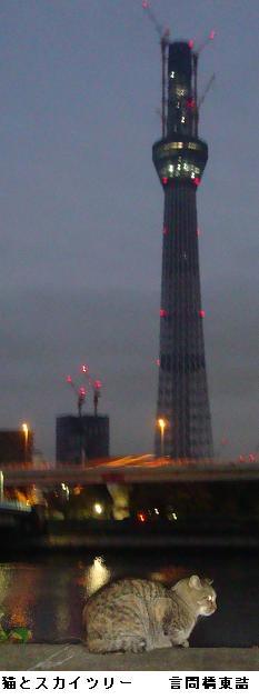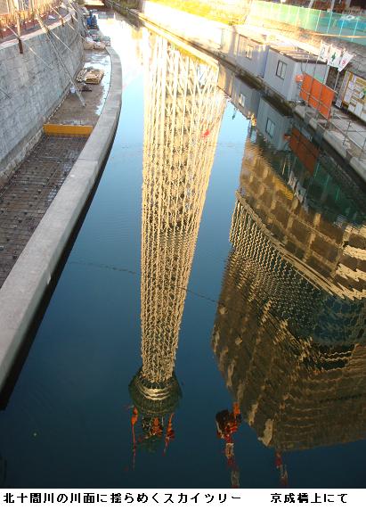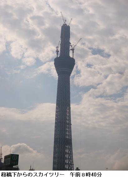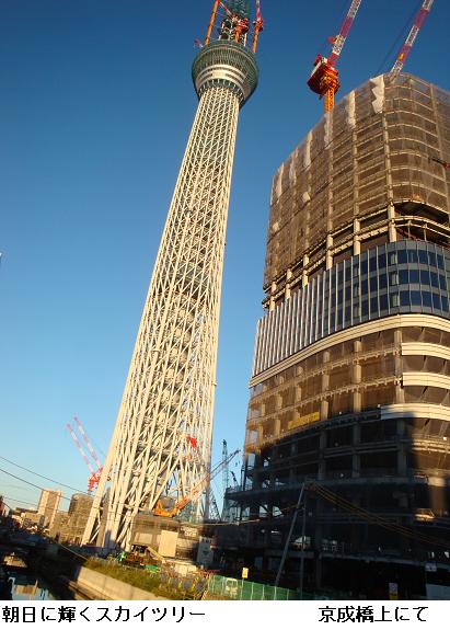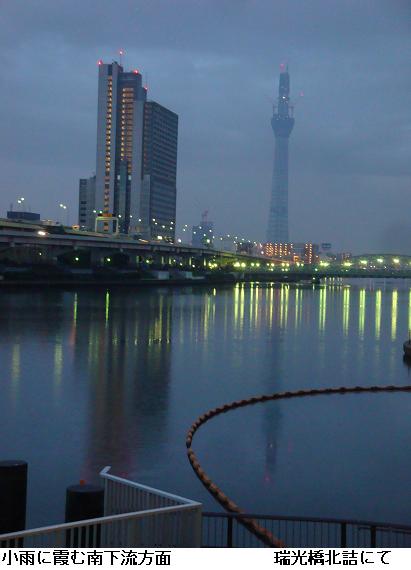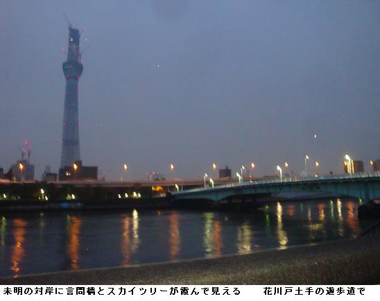 午前5時30分、夜中に降っていた雨も止んだようなので家を出掛けて、僅かに白み始めた隅田公園を南下、吾妻橋辺りまで来るとどうやらまた降り出してきたらしい。昨日のようにずぶ濡れになるのは厭なので、今来た道を引き返す。遊歩道は土のみちでぬかるみが多いので、土手のコンクリートの道を急いだ。小雨の中、言問橋と対岸に見えるスカイツリーをカメラに収めた。スカイツリーは完成の暁には634m、現在周辺の人人はその威容に驚き、やれ観光だ、グルメだと騒いでいるが、それも完成後2・3年のことだろう。いやはや、世界ではもはやスカイツリーなんて目じゃありませんたい。そんなことを考えながら、帰宅した。