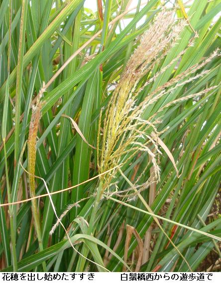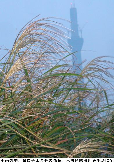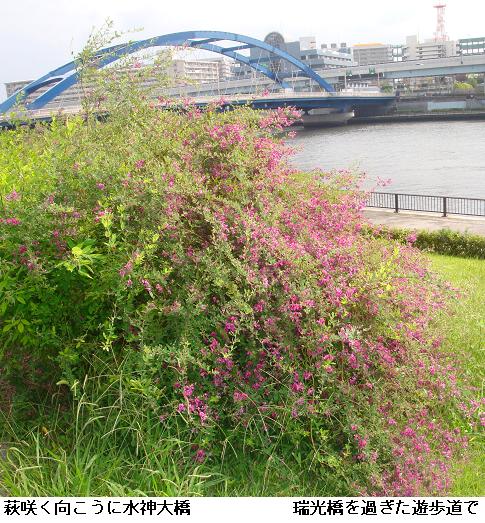 何となく寝坊。目が覚めたのは6時過ぎ。朝食後、桜橋~水神大橋間をひと回りする。桜橋から、今戸・橋場のテラスを北上。荒川区の隅田川遊歩道を北上。川辺のススキが今頃になって花穂を出し始めている。全般的に花穂のまだ出ていないが、これも猛暑だった所為なのかな? 昨日写した萩の花を通して、逆に水神大橋を写してみる。