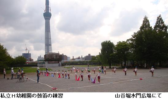 公園を抜けると、墨堤通りを南下して桜橋を渡り、山谷堀の水門広場に来ると今戸にあるH幼稚園の園児が鼓笛の練習をしていた。近くある運動会もしくは秋のイベントで披露されるものなのだろう。