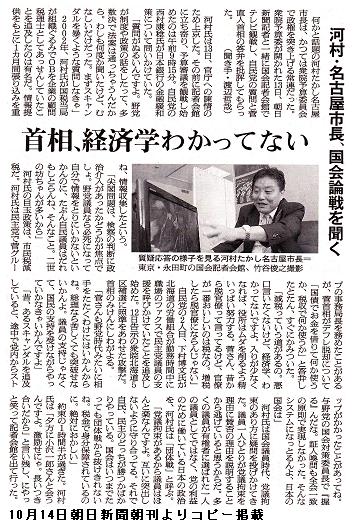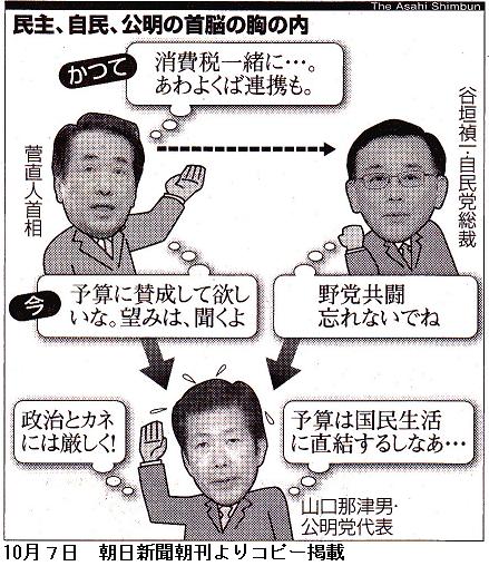 ただ、いつもは菅内閣を早期の衆院解散に追い込む考えを強調しているのに、この日は直接的な解散要求は見送った。「首相がなすべきことは内閣総辞職か、一刻も早く衆院を解散して国民に信を問うことだ」と要求したのは稲田氏だった。/自民党にとって、今国会で主導権を握るためには、公明党など他の野党との共闘態勢を築く必要がある。民主党候補との事実上の一騎打ちとなる24日の衆院北海道5区補選では、公明党の支援も得たい。その公明党は早期解散を回避しようとしており、谷垣氏は「友党への配慮」(自民党幹部)を優先したようだ。 (jijicom、2010/10/06―19:55)