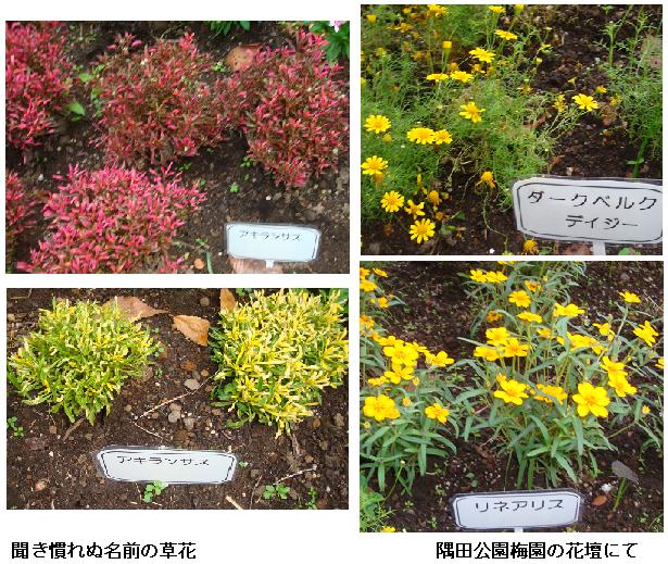 隅田公園の梅園にある花壇には見知らぬ名前の草花が植えてある。カメラに納め、帰宅後色々と調べてみた。