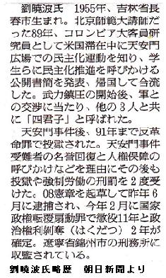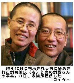 ノーベル平和賞に劉暁波氏 服役中、中国当局の反発必至 ―― 【ロンドン共同】ノルウェーのノーベル賞委員会は8日、2010年のノーベル平和賞を、中国の著名な民主活動家、劉暁波氏(54)=(国家政権転覆扇動罪)で服役中=に授与すると発表した。「長年、中国で基本的人権(の確立)のため非暴力的な手段で闘ってきた」ことが授賞理由。国内に住む中国人がノーベル平和賞を受賞するのは初。受刑者への授与も異例だ。/同委員会は劉氏が1989年の天安門事件に参加し、共産党一党独裁体制の廃止などを訴えた2008年の「〇八憲章」の起草を主導したことに言及。中国に「世界第2の経済大国として、一層の責任を持たなければならない」と人権状況の改善を強く迫った。/昨年の受賞者であるオバマ米大統領は同日、劉氏の受賞決定を歓迎し、劉氏の即時釈放を求める声明を発表した。/劉氏の妻、劉霞さん(49)は共同通信に、「中国で民主化運動に携わる友人らへの励みになる」と喜びを語った。/一方、中国政府は同日、駐中国ノルウェー大使を呼び、正式に抗議。中国外務省報道局長は談話で、劉氏を「犯罪者」と批判したうえで、平和賞授与は「賞の趣旨に完全に背いており、平和賞に対する冒とくだ」と強く反発した。 (共同通信、2010/10/09 00:37)