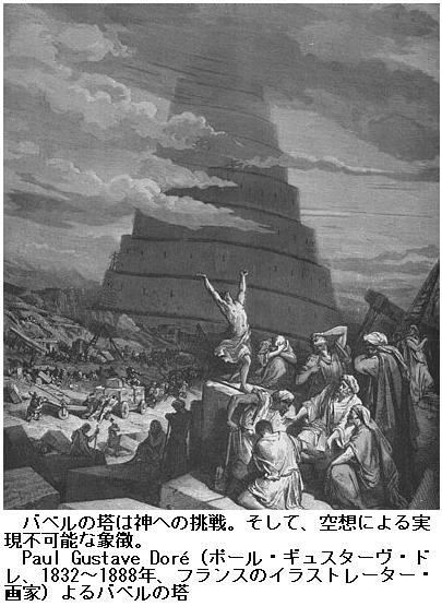 旧約聖書に曰く「世界中は同じ言葉を使って、同じように話していた。/東の方から移動してきた人々は、シンアル(シュメール)の地に平野を見つけ、そこに住み着いた。/彼らは、「煉瓦を作り、それをよく焼こう」と話し合った。石の代わりに煉瓦を、漆喰の代わりにアスファルトを用いた。/彼らは、『さあ、天まで届く塔のある町を建て、有名になろう。そして、全地に散らされることのないようにしよう』と言った。/主は降り給いて、人の子等が建てた、塔のあるこの町を見て、言われた。『彼らは一つの民で、皆一つの言葉を話しているから、このようなことをし始めたのだ。これでは、彼らが何を企てても、妨げることはできない。我々は降って行って、直ちに彼らの言葉を混乱させ、互いの言葉が聞き分けられぬようにしてしまおう。』/主は彼らをそこから全地に散らされたので、彼らはこの町の建設をやめた。/こういうわけで、この町の名はバベルと呼ばれた。/主がそこで全地の言葉を混乱(バラル)させ、また、主がそこから彼らを全地に散らされたからである。」(創世記、11章、1~9節)