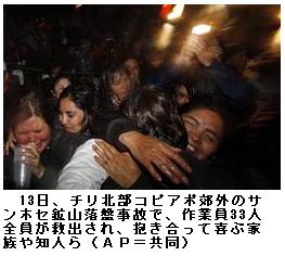 チリ 地底から全員生還 ―― 【コピアポ(チリ北部)=加藤美喜】チリ北部サンホセ鉱山の落盤事故で、地下七百メートルに閉じ込められた作業員三十三人の救出作業が十三日夜(日本時間十四日午前)、完了し、事故発生から六十九日ぶりに全員が地上に生還した。世界中がかたずをのんで見守った世紀の救出作戦は大成功を収めた。/午後十時(同午前十時)前、最後の一人のルイス・ウルスアさん「54」が引き上げられると、鉱山前の家族のテント村や近郊のコピアポ市中心部では一斉に歓声がわき起こった。作業員の後に残った救助隊員も、無事に地上に引き上げられた。ウルスアさんは、出迎えたピニェラ大統領に「救助隊員の皆さんに感謝します」と語った。/作業員たちは順次医師の診察を受け、ヘリでコピアポ市内の病院へ搬送された。マニャリク保健相は十三日夕、作戦完了の数時間前の時点で、七人が集中治療室で治療を受け、うち一人は急性肺炎にかかっていると述べた。二人が深刻な歯の感染症にかかり、全身麻酔による手術が必要な状態だという。/落盤事故は八月五日に発生、二十二日に三十三人全員の生存が確認された。地中深くまで直径約七十センチの縦穴を掘り、一人乗りの特殊カプセル「フェニックス(不死鳥)」を使って一人ずつ引き上げる救出作戦は大幅に短縮され、二カ月弱での成功となった。