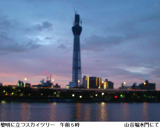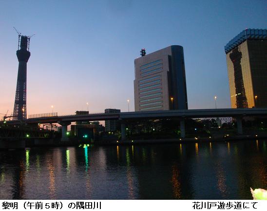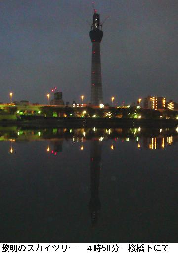本日の東京の日の出は5時18分。午前5時の山谷堀広場はまだ薄暗い。黎明の中に東京スカイツリーが一際聳え立っている。桜橋~水神大橋間を一巡。