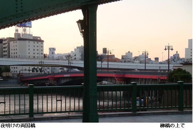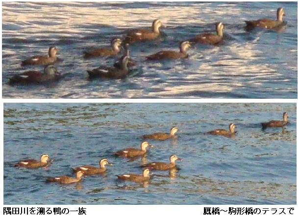 まだ暗い、隅田公園を南下。桜橋~両国橋の隅田川を一巡。公園を抜けると江戸通りを南下、蔵前警察署の横から榊神社前から柳橋へ。両国橋をわたるとテラスにおりて、吾妻橋まで北上。厩橋のテラス昇降口を降りたところで、久し振りにT氏と会ったしで、少しの間立ち話。厩橋から駒形橋にかかるところで、鴨の一家か? 9羽の群れが隅田川の川面で朝日を浴びながら川を溯っていた。墨田区役所裏か向島の遊歩道を桜橋まで北上。桜橋を渡って帰宅する。万歩計は久し振りに11331歩、7.36kmと1万歩を越えていた。
