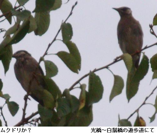 瑞光橋を過ぎた桜並木にとりの集団が屯している。先日のテレビ報道で何でも我孫子周辺でムクドリの大群が棲み付き住民が困惑していると聞いていたので、「もしや?」と、そばに近寄ると、数十羽の群れが一斉に飛び立った。かろうじて逃げ遅れた2羽をカメラに収めてみたが、果たしてムクドリかどうかは判定できない。