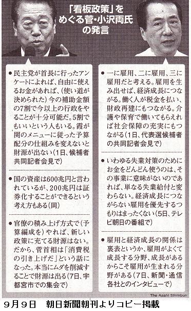 明日14日(火)はいよいよ民主党代表選。マスコミは菅優勢を伝えるが、無記名投票というから、選挙民の手前意思表明をした国会議員も心変わりする可能性は十分にある。形勢は伯仲と伝えるがどちらかが大差でということも無きにしも非ず。政策面での論議は小沢氏の方が正論だとは思うが、不謹慎な言い方をすれば、大変オモロイ。なんでも小沢氏のスキャンダル記事が週刊誌に飛び交っているという。あまり、政治とは関係のないこのような記事に振り回される議員はいないと思うが、政争の道具にされかねない危惧はある。