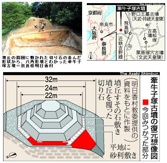 斉明天皇の墓、ほぼ確実 牽牛子塚古墳は八角形墳 奈良 ―― 大化改新で知られる中大兄皇子(なかのおおえのおうじ=天智天皇)の母、斉明(さいめい)天皇《594~661》の墓との説がある奈良県明日香村の牽牛子塚(けんごしづか)古墳(国史跡)が、当時の天皇家に特有の八角形墳であることが確認された。明日香村教育委員会が9日、発表した。墳丘全面が白い切り石で飾られ、内部の石室も巨大な柱状の切り石で囲われた例のない構造だったことも判明。斉明天皇は巨石による土木工事を好んだとされ、被葬者が同天皇であることがほぼ確実になった。/明日香村教委は、飛鳥地方の古墳群と藤原宮跡の世界遺産登録に向け、牽牛子塚古墳を昨年9月から調査。墳丘(高さ約4.5メートル)のすそは上からみると八角形状に削られており、北西のすそから3辺分の石敷き(長さ約14メートル)が見つかった。縦40~60センチ、横30~40センチの凝灰岩の切り石が石畳のように3列(幅約1メートル)にすき間なく並べられており、八角形になるように途中で約135度の角度で折れ曲がっていた。/墳丘は対辺の長さが約22メートルで3段構成だったと推定され、石敷きの外側に敷かれた砂利部分を含めると約32メートルに及ぶという。三角柱状に削った白い切り石やその破片が数百個以上出土し、村教委は、これらの石約7200個をピラミッド状に積み上げて斜面を飾っていたとみている。/また、墳丘内の石室(幅5メートル、奥行き3.5メートル、高さ2.5メートル)の側面が柱状の巨大な16の安山岩の切り石(高さ約2.8メートル、幅1.2メートル、厚さ70センチ)で囲まれていたことも確認された。/過去の調査では、石室が二つの空間に仕切られていたことが判明している。斉明天皇と娘の間人皇女(はしひとのひめみこ)を合葬したと記された日本書紀の記述と合致するほか、漆と布を交互に塗り固めて作る最高級の棺「夾紵棺(きょうちょかん)」の破片や間人皇女と同年代の女性とみられる歯などが出土していた。/これまでの発掘成果と合わせ、「一般の豪族を超越した、天皇家の権威を確立するという意思を感じる。斉明天皇陵と考えるほかない」(白石太一郎・大阪府立近つ飛鳥博物館長)など、専門家らの意見はほぼ一致している。/一方、宮内庁は同古墳の西に約2.5キロ離れた円墳の車木(くるまぎ)ケンノウ古墳(奈良県高取町、直径約45メートル)を、文献や伝承などから斉明天皇陵に指定。「墓誌など明らかな証拠が出ない限り、指定は変えない」(福尾正彦・陵墓調査官)としている。/現地見学会は11、12日の午前10時~午後4時。近鉄飛鳥駅から徒歩15分。問い合わせは村教委文化財課《0744-54-5600》へ。 (asahi.com 2010年9月9日22時43分)