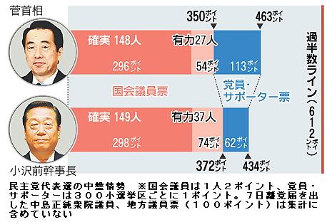 民主党代表選・序盤の国会議員票の情勢 ―― 毎日新聞は、民主党代表選《14日投開票》の序盤情勢を探るため、党所属国会議員412人の支持動向を調査した。3日現在、小沢一郎前幹事長が180人超、菅直人首相が160人超の支持を得ている。国会議員票では小沢氏が一歩リードし、菅首相が猛追している。投票先を決めかねている議員が60人異常いる他、世論動向などにより投票態度を変える議員もいるとみられ、両陣営の争奪戦は激しさを増しそうだ。/1日の告示後、衆参両院の党所属国会議員に対する本人取材を基本に、党内各グループの対応や民主党支持労組の動向を加味して集計した。国会議員票は1人2ポイントに換算され、総計1224ポイントのほぼ3分の2を占める。/3日現在で、小沢氏は185人に届く情勢。このうち、本人の意思表明など確実に小沢氏に投じる議員は122人。最終決断には至っていないが、投票が有力な議員が63人。党内最大勢力の小沢グループ《約150人》と支持表明した鳩山由紀夫前首相グループ《約50人》で計約200人となるが、現段階では固め切れていない。/一方、菅首相は164人。やや後れを取るが、確実な議員は122人と拮抗(きっこう)している。菅首相支持が有力なのは四十二人。首相グループ《約40人》に、支持表明した前原誠司国土交通相グループ《約40人》、野田佳彦財務相のグループ《約30人》の2グループの合算数《約110人》を上回り、支持を上積みしていることを示している。/衆院306人の内訳は小沢氏139人、菅首相129人、未定38人。参院106人では小沢氏46人、菅首相35人、未定25人。衆参とも小沢氏が先行しているが、参院での優位は小沢氏と密接な協力関係にある労組系議員が多いためとみられる。今後は態度を決定していない旧民社党グループ《約30人》の動向も焦点の一つだ。/衆院の新人議員143人は、小沢氏が代表、代表代行時代に擁立され、「小沢チルドレン」とも呼ばれる。しかし、投票先は小沢氏65人、菅首相55人、未定23人で、菅首相が善戦している。党本部の判断で名簿に掲載された比例単独議員35人に限ると、小沢氏22人、菅首相8人、未定5人で、小沢氏が引き離している。/衆院の新人議員は所属国会議員の35%を占める。菅首相の陣営も「新人の動向が勝敗を左右する」(幹部)とみて、菅首相が告示前の先月下旬、新人を対象とする3日間の懇談会を開き、取り込みに動いた。小沢氏に対しては、「政治とカネ」問題への世論の批判が強くあり、小沢氏の陣営では「切り崩された新人議員も少なくない」(幹部)と見ている。/「確実」「有力」の衆院議員は計268人で、小沢氏139人、菅首相129人だが、小選挙区に基盤を持つ議員(比例復活を含む)では、小沢氏111人に対し、菅首相が119人でリード。後援会員などが多い党員・サポーター《計300ポイント)の動向に影響を与える可能性もある。 (毎日新聞 2010年9月4日 2時30分《最終更新 9月4日 2時40分》)