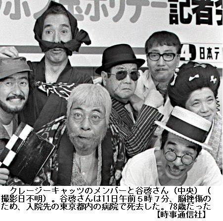 谷啓さん急死…階段から転落し顔面を強打 ―― 7人組「クレージーキャッツ」のメンバーとして活躍し、「ガチョ~ン」などのギャグを流行させたタレントで俳優の谷啓(たに・けい、本名・渡部泰雄=わたべ・やすお)さんが11日午前5時7分、脳挫傷のため東京都三鷹市の杏林大病院で死去した。78歳。東京都出身。自宅の階段で転落し、頭などを強く打ち搬送されていた。葬儀・告別式は密葬で行い、後日お別れの会を開く。クレージーのメンバーは、07年3月の植木等さんに続き5人が鬼籍に入った。/警視庁三鷹署によると、谷さんは10日午後5時50分ごろ、自宅の階段で転倒。1階から2階に上がる際につまずき、前のめりに倒れた。その際、受け身を取ることができず顔面を強打した。/「バタン」という大きな音に気づいた妻の和子さんが119番通報。谷さんは病院に緊急搬送されたが、11日早朝、家族に看取られ息を引き取った。病院には早朝から関係者が駆けつけ、遺体は同日午後、自宅に戻った。/昨年3月、進行役を務めていたNHK教育の美術教養番組「美の壺」を降板。紙屋聡プロデューサーは「1日がかりの収録になるので、負担を考えての交代でした。最後の収録の後、肩の荷が下りたようなホッとした顔をしていたのが印象的です。大スターと一緒に仕事ができて光栄でした」と振り返った。/レギュラー出演していた映画「釣りバカ日誌」シリーズの最終作「釣りバカ日誌20 ファイナル」《同12月公開》が遺作となった。/最近の様子について親しい関係者は「同じことを繰り返し話して、“セリフを覚えるのがつらい”とも話していた」と説明。別の知人は「体調は悪そうではなかったが、やせたという印象はあった」と話した。/谷さんは昨年から「ずっと仕事一筋の人生だったので、今後はのんびりと暮らしたい」と希望し、自宅で和子さんと一緒にテレビドラマを観賞したり、孫の面倒を見て過ごす時間が多くなっていたという。/ジャズにあこがれ、高校時代からトロンボーンを始め、ハナ肇さん率いるクレージーに参加したのは1956年。クレージーの中でも、よくしゃべる陽性のキャラクターで売った植木さんに対し、口数は少ないながら急所で笑いを取る役どころで“クレージーの第三の男”として存在感を発揮した。/「おとなの漫画」「シャボン玉ホリデー」などのテレビ番組に出演すると、「ガチョ~ン」の声とともに、開いた右手を閉じながら手前に引くギャグは流行語に。温厚そうな丸顔で愛され、「ビローン」「あんた誰」「谷だぁ!」などのギャグで一世風びした。米国のコメディー映画が好きで、芸名は米喜劇俳優ダニー・ケイをもじって決めた。/俳優としても映画「ニッポン無責任時代」など“無責任シリーズ”のほか、「図々しい奴」では主演。森繁久弥さんの主演ミュージカル「屋根の上のヴァイオリン弾き」などで名脇役としても活躍した。