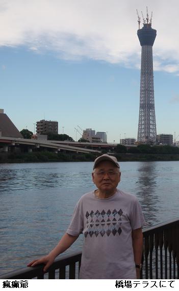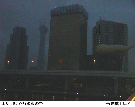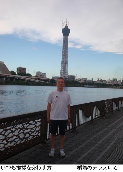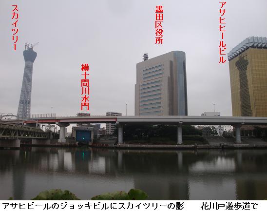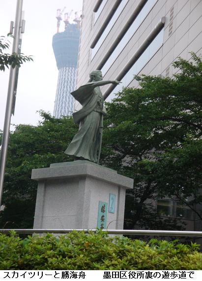 雨雲が垂れ込めて今でも降りそうな様子なのにスカイツリーは影がアサヒビールのジョッキビルにくっきりと映し出されている。水上バスの淺草ステーションの建設工事は朝早くから進められている。左岸の墨田区役所裏手の広場では勝安房先生が立っていらっしゃる。東京スカイツリーと一緒にカメラに収めさせてもらった。